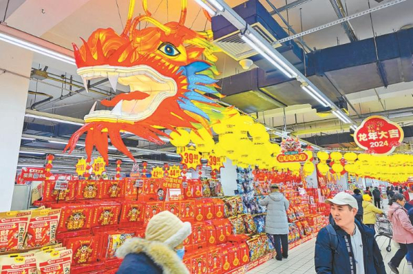 北京各大商超節(jié)日氛圍漸濃,在物美超市玉蜓橋店,新春節(jié)慶商品擺滿貨架,喜慶紅火的龍形掛飾裝點(diǎn)賣場。 記者 鄧偉攝