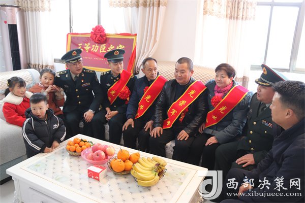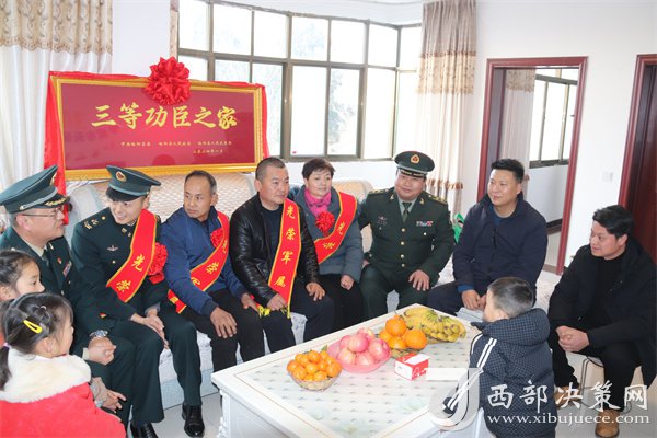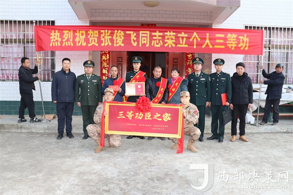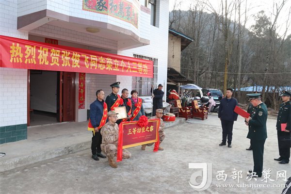 西部決策網(wǎng)訊  律回歲晚,年味漸濃。在陜西省漢中市略陽縣徐家坪鎮(zhèn)小山村張家莊,幾位身著軍裝的軍人手捧喜報(bào),抬著三等功臣之家的牌匾,在人群中格外的顯眼。由縣人武部,退役軍人事務(wù)局,鎮(zhèn)村領(lǐng)導(dǎo)組成的隊(duì)伍帶著新年的問候和祝福,為榮獲三等功的張俊飛家庭送來立功喜報(bào)、三等功臣之家的牌匾和慰問金,張俊飛所在的部隊(duì),委派專人到地方上聯(lián)合當(dāng)?shù)夭块T將這份殊榮親自送到張俊飛的家里,給小山村增添無限的喜慶和榮光。
