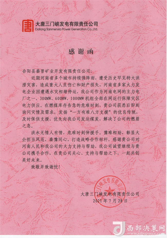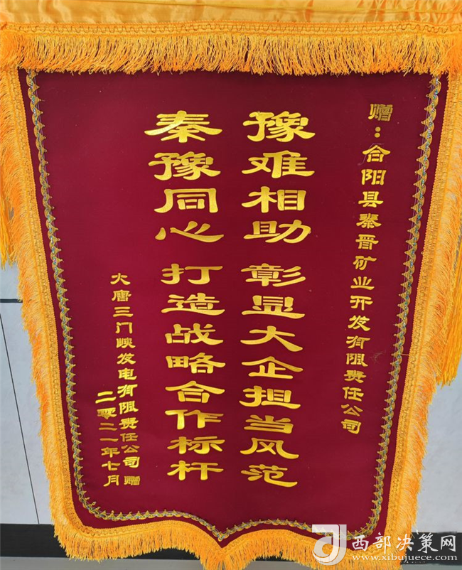 近日,大唐三門峽發(fā)電有限公司為秦晉集團(tuán)公司送來了感謝函,并將一面寫有“豫難相助,彰顯大企擔(dān)當(dāng)風(fēng)范,秦豫同心,打造戰(zhàn)略合作標(biāo)桿”的錦旗送到了秦晉集團(tuán)公司,對(duì)秦晉集團(tuán)“一方有難八方支援”的大愛精神表示感謝?。▓D/文:聶曉英)